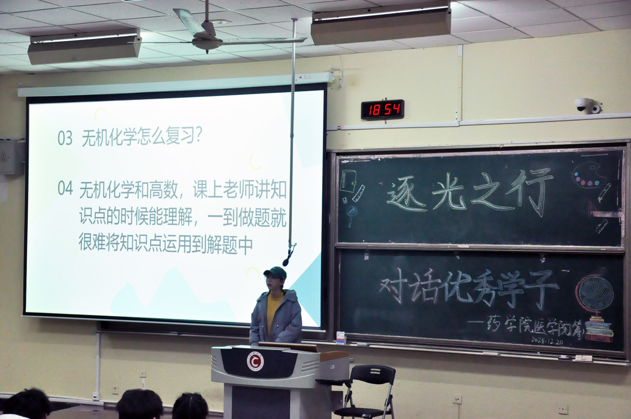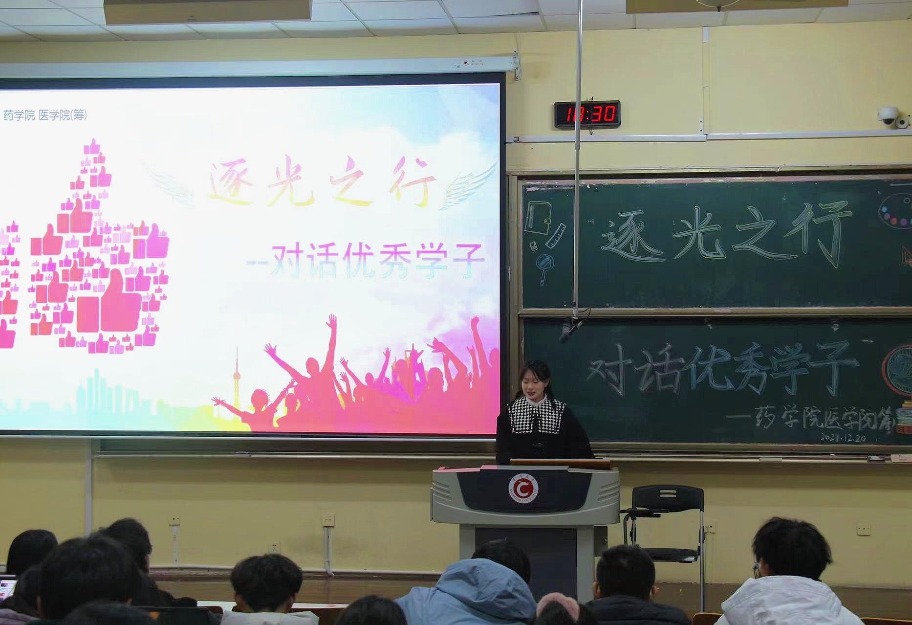 12月20日晚,ok138太阳集团中国官方网站于W7举行 “逐光之行——对话优秀学子”活动,此次活动由学风部部长李妍主持,邀请了制药192卢潇同学,制药201郑鑫雨同学和药学201姚亦同学为大家作分享,太阳官网21级新生积极参加。