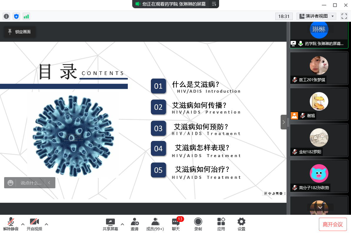 张教授通过共享PPT的形式,详细地介绍了艾滋病基本知识、传播途径以及如何防治艾滋病等。其中,张教授主要针对当前艾滋病在青年流行现状,分析艾滋病在大学生之间流行传播的原因,并提出有效的解决方案。讲座效果良好,张教授通过列举丰富的案例,让晦涩的理论变得浅显易懂,让同学们进一步认识和了解防艾的必要性和严重性。