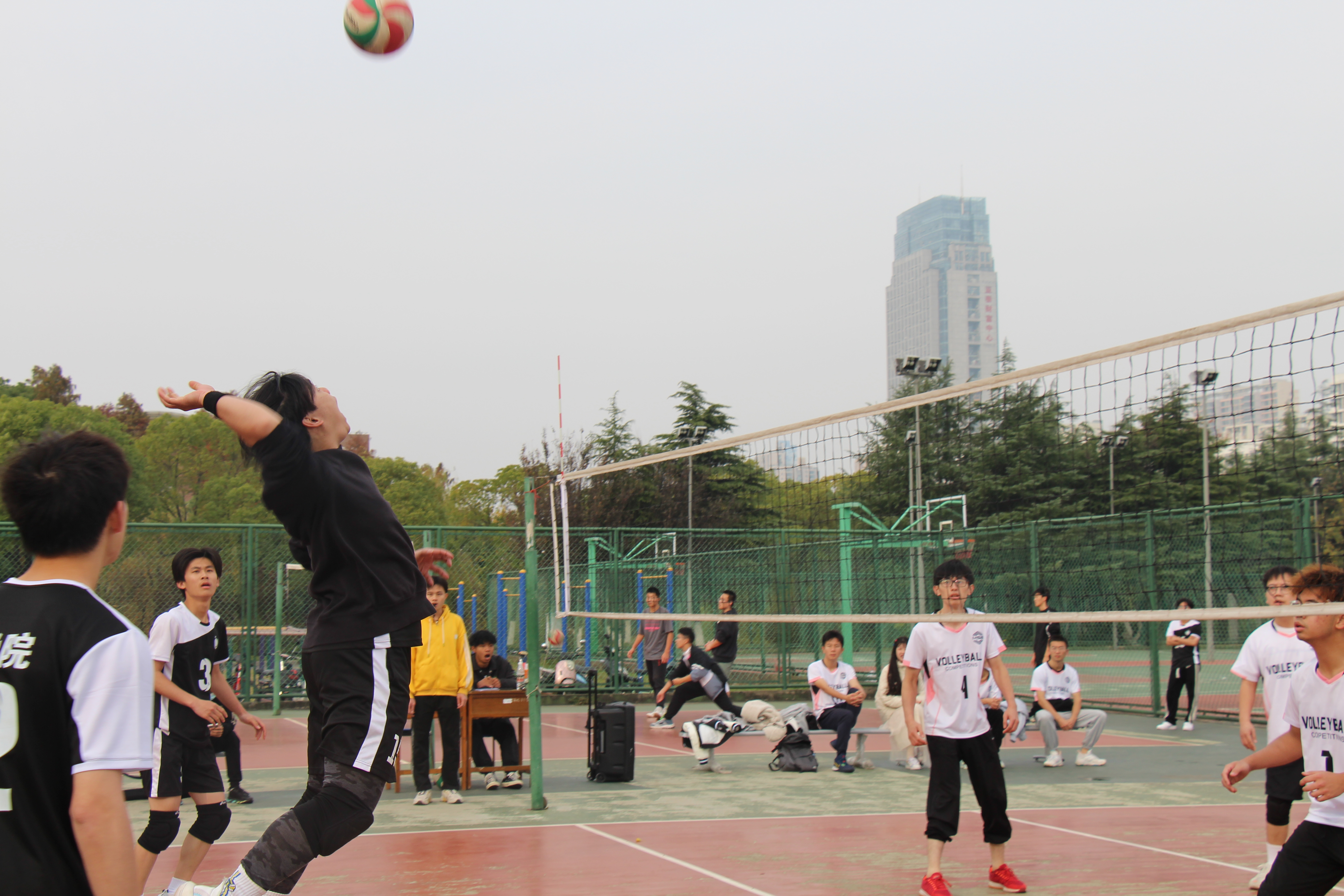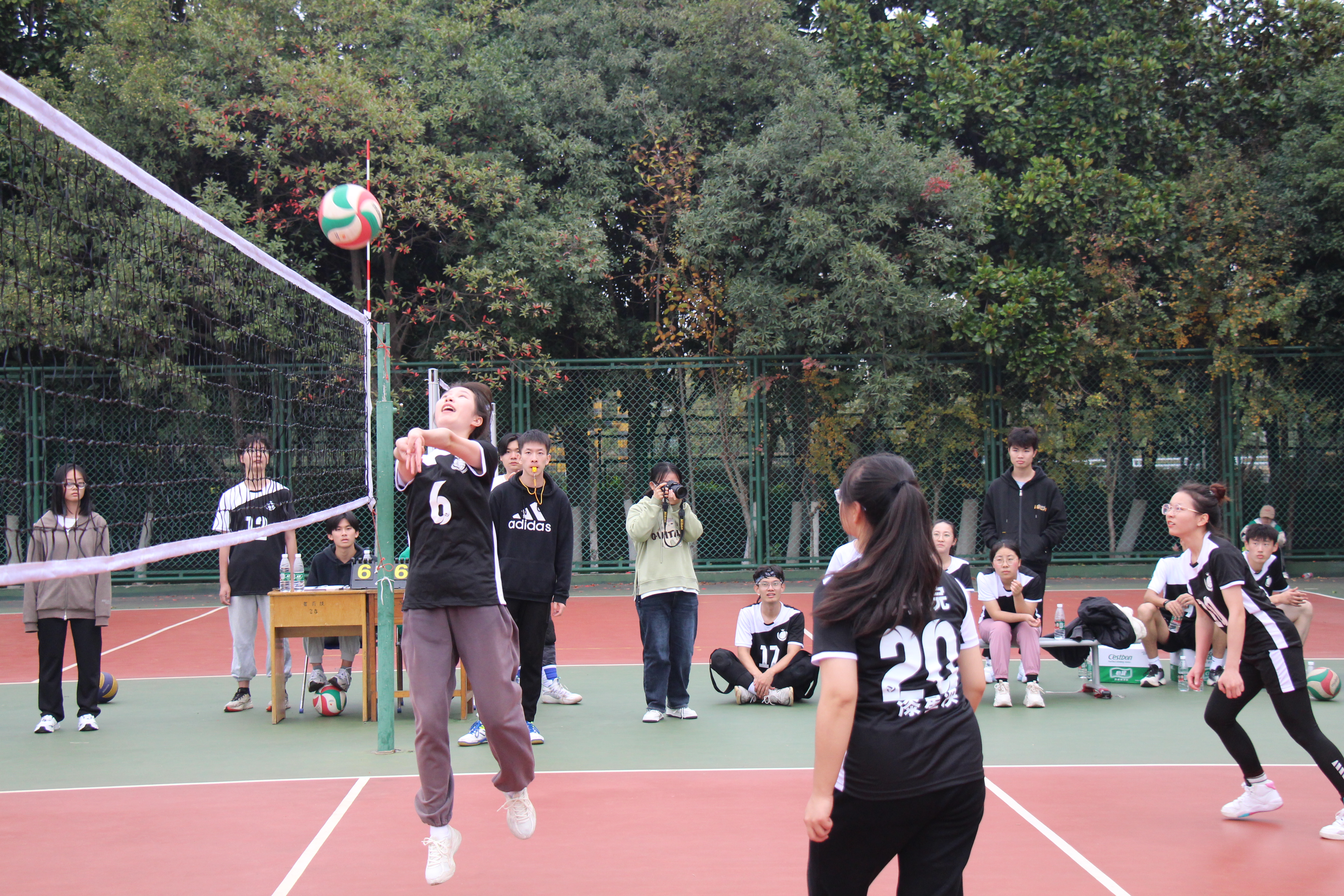 “啪——”一记重重的扣球射出。队员们丝毫不敢转移视线,调动全身肌肉奔跑、救球、反击。大家肆意挥洒着汗水,用每一次搏击发泄躁动的热情,用每一次跳跃释放难掩的激动,用每一声呐喊宣泄暗暗的紧张。每一珠汗水的滴落都是拼搏的豪气,每一秒团结奋斗的身影都是青春的壮丽!最终,随着一声哨响,一切尘埃落定。一声声欢呼永绕耳畔,一幕幕合影永恒记忆。