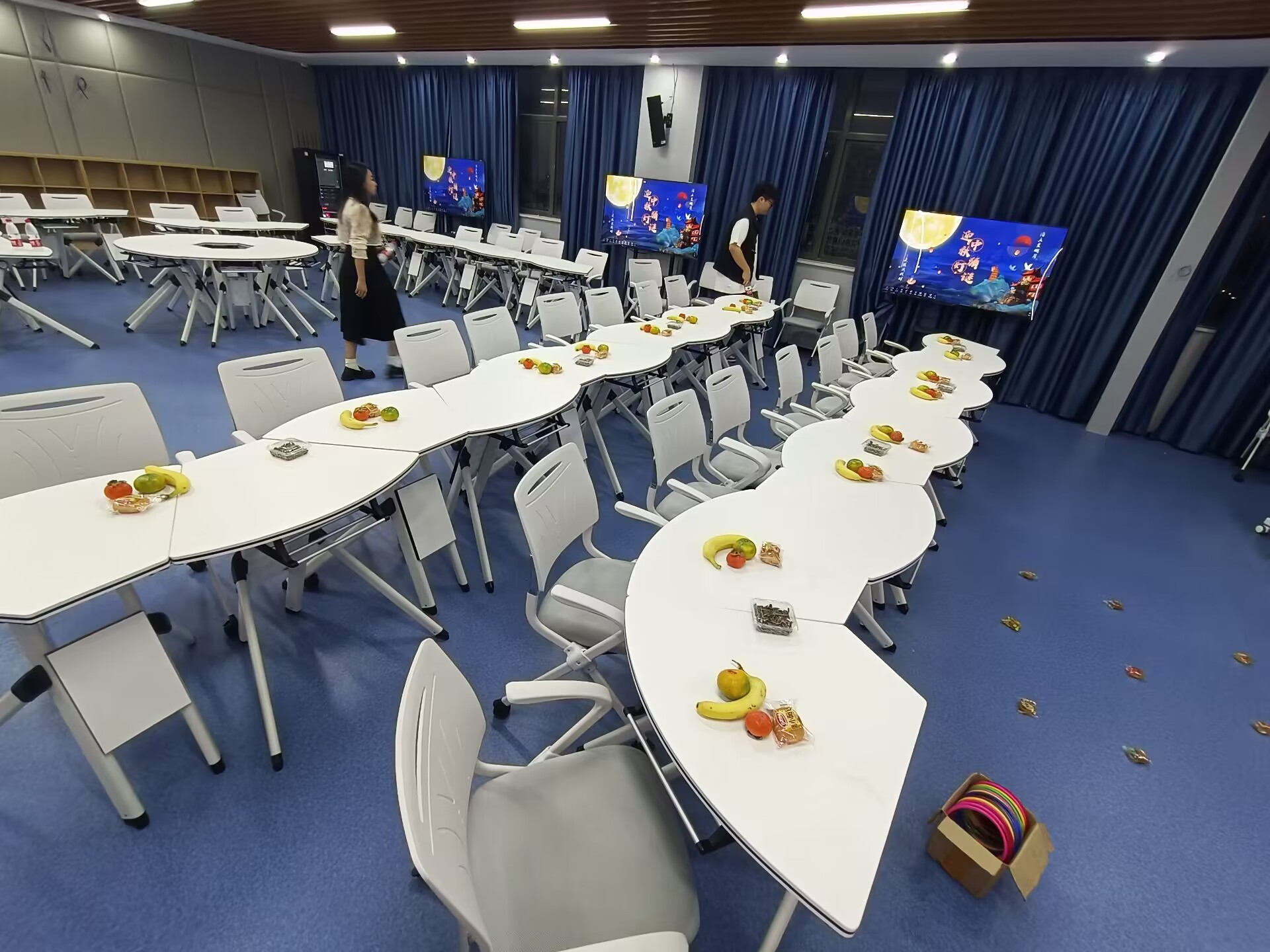 活动开始前,院学生会成员精心布置了教室,明亮的灯笼和绚丽的彩灯点缀着舞台,营造出温馨喜庆的氛围。